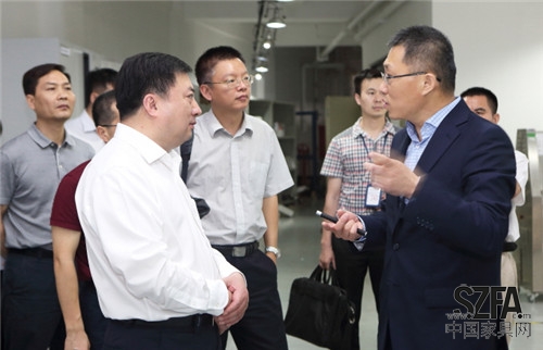 坪山新區(qū)領(lǐng)導(dǎo)劉勝副主任(左)、吳德林主任(中)在侯克鵬會(huì)長(右)陪同下考察深家協(xié)家具研發(fā)部