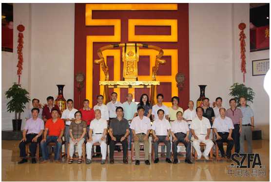圖說:以中國工藝美術協(xié)會王山秘書長為首的復評專家考評組在源天福公司3.6米的頭把交椅前合影