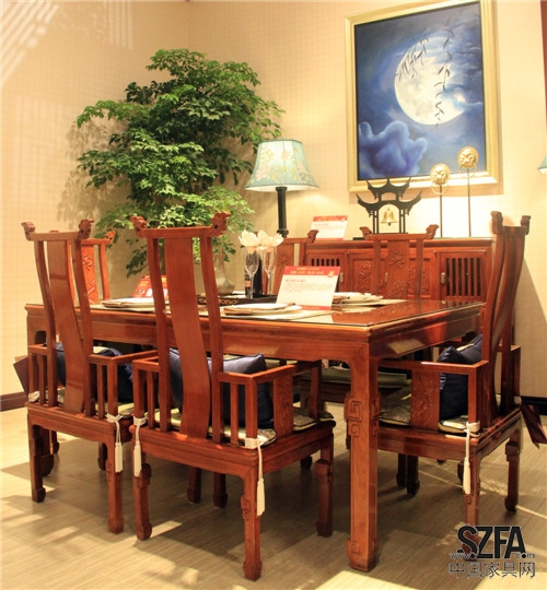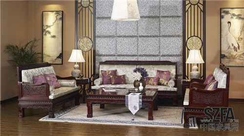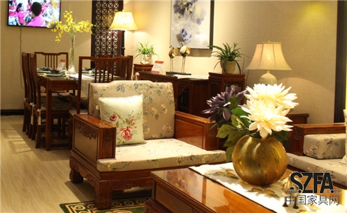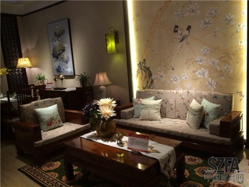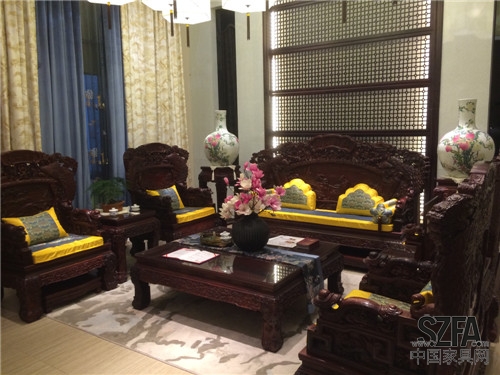 這些作品中,花開富貴床氣韻飽滿,大氣卓然,還蘊含著夫榮妻貴的美好寓意。而纏枝蓮紋梳化則在清式傳統(tǒng)家具融入西式風(fēng)格,金屬與木質(zhì)的結(jié)合既剛毅又富有時尚氣息。兩者作為祥利集團本次的參評作品以其優(yōu)良、科學(xué)的設(shè)計及精致的做工贏得了評委的一致好評。各具特色的紅木家具置身于古典與時尚交融的展廳中,吸引了大量客商上前觀摩咨詢,成為本屆展會的一大亮點。