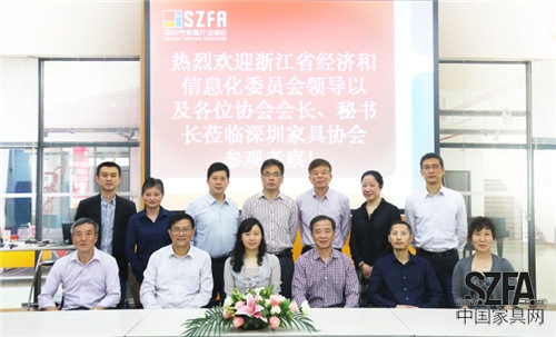 2014年11月28日,浙江省經(jīng)濟和信息化委員會法規(guī)處處長李丹、副處長鄭志靈與浙江省家具協(xié)會會長蔣鴻源、浙江省三會秘書長吳祎泓、浙江省品牌促進會秘書長徐偉榮、浙江省軟件協(xié)會秘書長屠嬌絨、浙江省保健協(xié)會秘書長張艷、浙江省服裝協(xié)會秘書長沈茉莉、浙江省投融資傳協(xié)會秘書長威健明、浙江省照明協(xié)會秘書長許紀(jì)生、浙江省中小企業(yè)協(xié)會副秘書長張凱、浙江省燃器具協(xié)會副秘書長樂加礎(chǔ)一行在深圳市家具行業(yè)協(xié)會秘書長洪小惠的陪同下參觀考察深圳市家具行業(yè)協(xié)會,觀摩了深圳家協(xié)包括會展策劃、設(shè)計研發(fā)、傳媒中心、集成研發(fā)、產(chǎn)業(yè)規(guī)劃以及檢測中心在內(nèi)的七大模塊運作現(xiàn)狀。