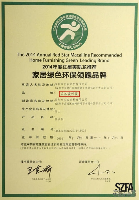 左右皮沙發(fā)榮獲“綠色環(huán)保領(lǐng)跑品牌”