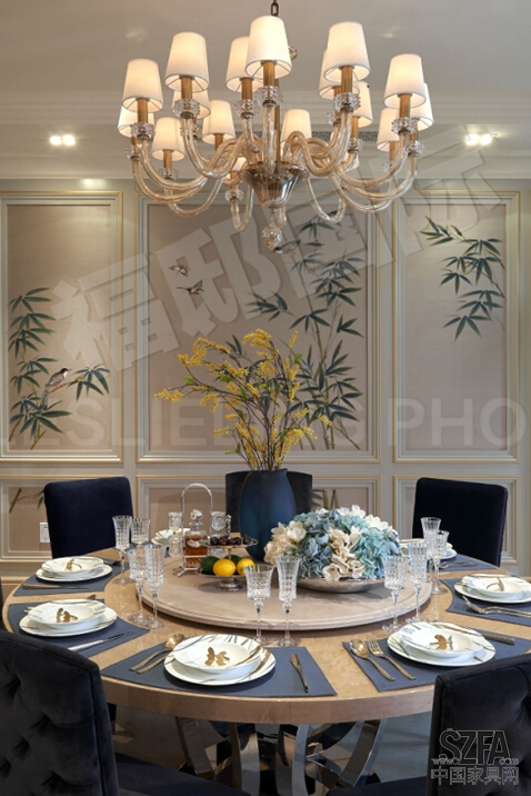 本次綠城桃花源樣板房的軟裝設(shè)計(jì)以高雅奢華的法式風(fēng)格為基調(diào),融入儒雅禪韻的東方元素。在風(fēng)格的把握上,福邸保留了之前樣板房所呈現(xiàn)的奢華感,通過對木飾面、墻紙等產(chǎn)品的選擇,減輕了空間的厚重感,取而代之的是一種優(yōu)雅而時(shí)尚的環(huán)境氣氛。