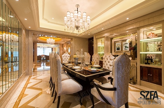 胡桃木飾金的弧形長餐桌為標(biāo)準(zhǔn)的西式餐廳增添了幾分圓融之氣,絲絨餐椅將墻面的色彩和光影完美得過渡到餐桌上來,高踞椅背之上的鎏金飾角靜訴著席間貴賓的顯赫。也唯有這樣迷人的淺紫色才能襯著這氣勢非凡的扣釘軟包墻面,而皇冠造型的床靠和曲線玲瓏的臥榻是主人最私密也最無法割舍的貴族情懷。沿墻而立的妝臺(tái)和依著窗沿的落地?zé)?、休閑椅是福邸的設(shè)計(jì)師融入現(xiàn)代審美和功能需求,以煥然一新的姿態(tài),對(duì)空間做出的最大發(fā)散。