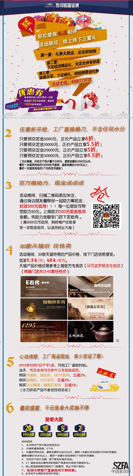 更多優(yōu)惠活動詳情,可致電活動專線。消費(fèi)者也可光臨馬可波羅各大店面現(xiàn)場體驗(yàn),相信一定會有驚喜收獲。