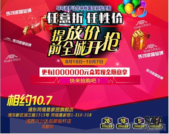 據(jù)悉,為了感謝消費(fèi)者長期以來對馬可波羅瓷磚的支持和厚愛,馬可波羅瓷磚特設(shè)置一百萬眾籌現(xiàn)金抵用額度,與消費(fèi)者在微信朋友圈進(jìn)行互動,消費(fèi)者可在朋友的助力下眾籌現(xiàn)金參與消費(fèi)抵扣;除此之外,在10月7號的現(xiàn)場活動中,還有眾多免單名額供消費(fèi)者抽取,無論是馬可波羅的新老客戶,相信只要來到馬可波羅的終端店面,就總有一款瓷磚適合你,總有一種優(yōu)惠省到錢。