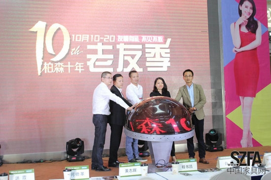 接著,此次活動最關鍵的一步開始了。紅星美凱龍領導和柏森領導站到臺上,在熱烈的掌聲下一起揭開了紅布并且將手按在啟動球上,“柏森十年老友季”七個大字呈現(xiàn)在大家眼前。