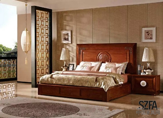 俗話說家和萬事興,而夫妻和合乃家和之本。瀚晟堂的這套夫婦和合臥房組合包括床、床頭柜、梳妝臺,以夫妻和諧同心為設計理念,寬厚用料,取坤卦象征大地母性般的承載、包容,以聚氣的“金斗型”造型風格為主,以求藏風聚氣,和氣生財。床為臥房家具的主體,最能營造臥房的和諧美滿感。該床沉穩(wěn)內(nèi)斂,床屏為高背式,箱式床體與高靠背床屏的對比設計顯得高低錯落有致;搭配方正的床頭柜,精美圓融的金鑲玉點綴,華美大氣;首尾呼應床屏上的圓形“祥云如意”浮雕,寓示著家庭的如意美滿。床搭配同樣造型的床頭柜、梳妝臺,處處考慮方圓結合,和諧統(tǒng)一。