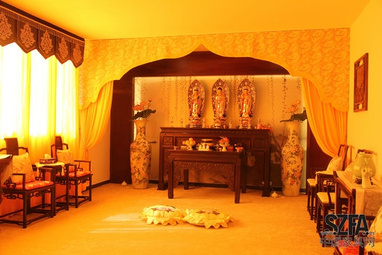 深圳紅木家具博物館佛堂,是由風(fēng)水大師妙靈設(shè)置并開光過的,佛堂中的三尊佛像分別為阿彌陀佛(中)、觀世音菩薩(左)、大勢至菩薩(右),三者合尊稱為“西方三圣”。這三尊佛像都為純金打造,以表達對佛祖的尊敬和虔誠。
