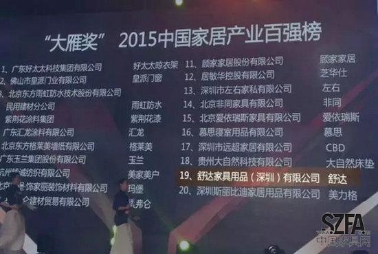 2015年12月27日,北京市國(guó)家會(huì)議中心,第三屆中國(guó)家居產(chǎn)業(yè)發(fā)展年會(huì)暨中國(guó)家居產(chǎn)業(yè)峰會(huì)隆重舉行,舒達(dá)中國(guó)區(qū)總經(jīng)理吳鄂先生受邀出席。峰會(huì)發(fā)布了“‘大雁獎(jiǎng)’2015中國(guó)家居產(chǎn)業(yè)百?gòu)?qiáng)榜”,作為軟體家具領(lǐng)軍品牌,美國(guó)舒達(dá)床墊榮獲該獎(jiǎng)項(xiàng)。
