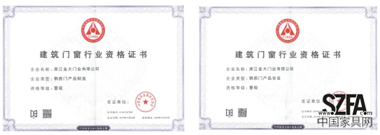 眾所周知,由中國建筑金屬結(jié)構(gòu)協(xié)會鋼木門窗委員會頒發(fā)的建筑鋼質(zhì)門行業(yè)制造、安裝雙一級資質(zhì),代表著國內(nèi)最高級別的資質(zhì)要求,是衡量企業(yè)綜合實力的重要因素,此次金大門業(yè)榮獲制造、安裝雙一級資質(zhì),意味著金大門業(yè)有能力承接各種級別工程項目中鋼質(zhì)門的制造及安裝資格,大大提升工程項目的綜合服務(wù)能力。