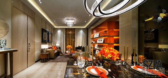 該設(shè)計(jì)以奪目的色調(diào)和鮮明的線條,客飯廳以鮮明的橙色為主色調(diào),配合華貴的藝術(shù)裝置豐富了整體的現(xiàn)代感盡顯戶主之品位。