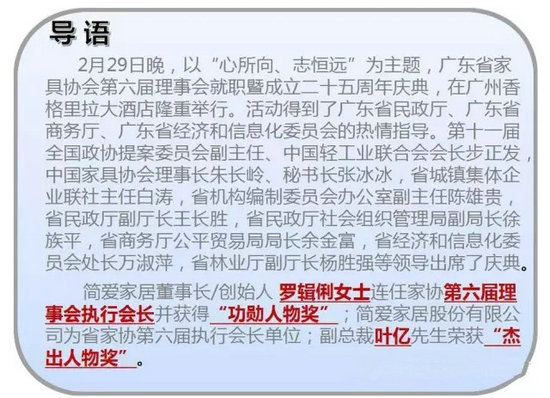 廣東省家具協(xié)會第六屆理事會就職暨成立二十五周年慶典是2016年家具行業(yè)的首場盛會。對于羅輯俐董事長而言這更是開年與好朋友的一次聚會。