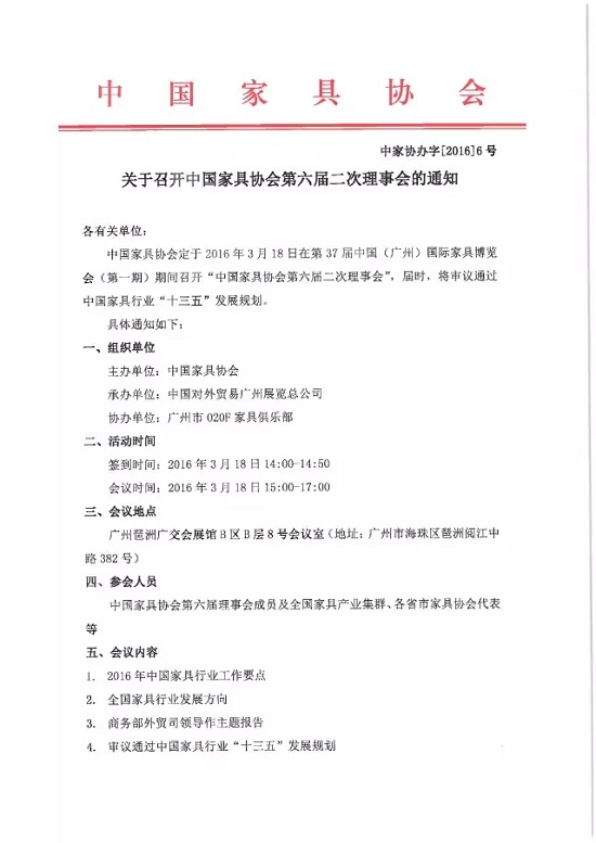 中國家具協(xié)會(huì)定于2016年3月18日即第37屆中國(廣州)國際家具博覽會(huì)(第一期)期間在廣交會(huì)展館8號(hào)會(huì)議室隆重召開“中國家具協(xié)會(huì)第六屆二次理事會(huì)”。屆時(shí),會(huì)議將審議通過中國家具行業(yè)“十三五”發(fā)展規(guī)劃。中國家具協(xié)會(huì)第六屆理事會(huì)成員及全國家具產(chǎn)業(yè)集群、各省市家具協(xié)會(huì)代表等將出席會(huì)議。