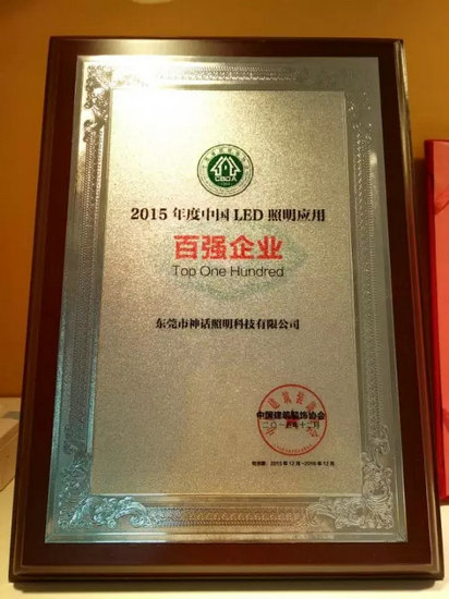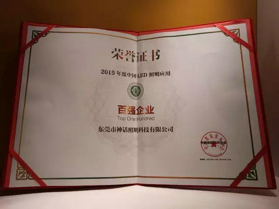 神話照明科技中國LED百強(qiáng)企業(yè)榮譽(yù)證書