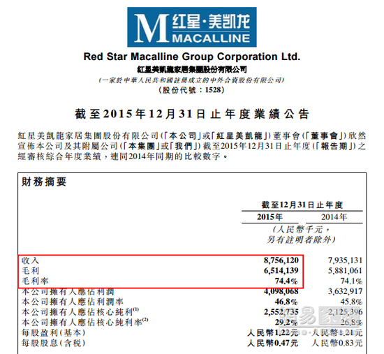 這是紅星美凱龍自2015年6月份在香港上市后的首份年度報告。根據(jù)報告,紅星美凱龍2015年毛利達65.14億元,與2014年的58.81元相比增長了10.76%。