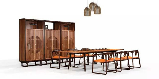 如懸“無所依傍貌”,椅背造型與茶柜頂部風格統(tǒng)一,粗狂的線條及圓形裝飾的巧妙結合,將整體襯托得美觀而不失韻味,時尚而不失文化。