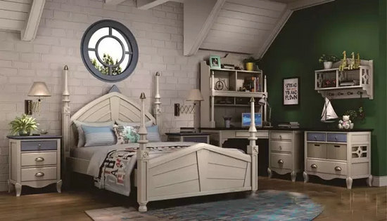 家具的表面經(jīng)過浮雕工藝處理,自然的木紋在白色油漆的襯托下,顯得高貴典雅。流暢的曲線與麻花柱相結(jié)合使整個空間不會顯得呆板,給人以愉悅的心情。床頭采用方柱與拱形結(jié)合 像似城堡的拱門有著守護與貴族的象征。