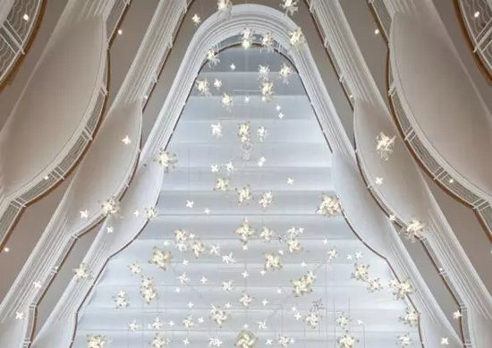 ▲半空中星星點(diǎn)點(diǎn)的燈光點(diǎn)綴了整個(gè)中庭,在波浪般的場景下,猶如各式各樣的海洋生物在自由自在地暢游。