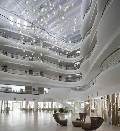 ▲大廳設(shè)計(jì)去除了中庭原有的歐式古典樓梯,變?yōu)楝摪住⒋緲愕耐霠?ldquo;鳥巢”形式,與波浪般的建筑形態(tài)渾然一體,保持中庭及四周公共區(qū)域?yàn)殚_放空間。