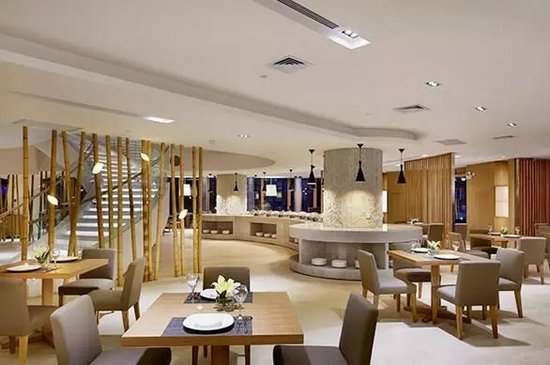 ▲中庭與西餐廳銜接處,巧妙創(chuàng)造出如竹林般的天然屏風(fēng),生動(dòng)的猶如海洋生物般的燈具點(diǎn)亮了這片竹林,既能恰當(dāng)?shù)卣趽踹^往人群的視線,又能將餐廳內(nèi)優(yōu)雅的氛圍流露出去。