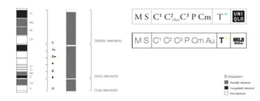 優(yōu)衣庫(UNIQLO)把服裝詮釋為生活風(fēng)格(Lifestyle)的一種組件,承諾持續(xù)提供時髦的、高品質(zhì)的、基本的休閑服裝,并在市場上以最低價格配置。其風(fēng)格元素的配置是:純色、基礎(chǔ)與功能化的形態(tài)、以綿和毛等自然纖維為原料、所用設(shè)計語言是簡單直接和中性、調(diào)性是靚麗干凈和輕盈。而無印良品(MUJI)的風(fēng)格元素配置則完全不同,因為其品牌基因不同。圖2為優(yōu)衣庫與無印良品的品牌解碼。