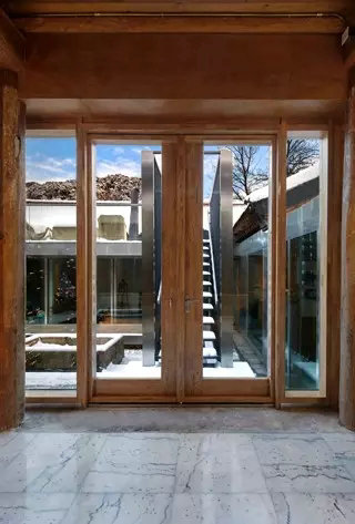 起居室內(nèi)對開的巨大門扇采用天地軸鉸鏈,承重150公斤。
