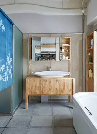 位于左廊東西兩側(cè)的衛(wèi)浴空間采用了兩種截然不同的設計,一種和風,一種現(xiàn)代。設計師不僅僅通過通過柜體、天花的特殊設計進行表達,甚至花灑、龍頭也必須別具特色。