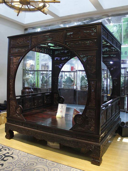 百子雙月洞架子床精選小葉紫檀制作,造型古樸、雕飾精美、寓意吉祥。床的設(shè)計(jì)概念象征“本固枝榮”,完全符合中國床文化的思想。在展廳現(xiàn)場,架子床引來眾人的圍觀,凡看見這個(gè)架子床的人,無不嘖嘖稱奇,贊嘆一翻。
