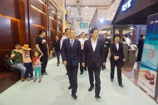 深圳市家具行業(yè)協(xié)會執(zhí)行會長侯克鵬(左)陪同青島貿(mào)促會會長馮文青(右)一行參觀青島國際家具展