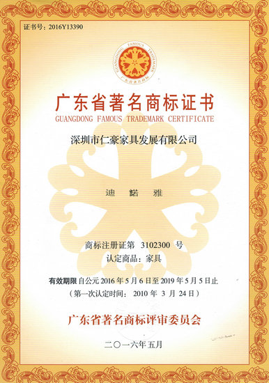 近日,經(jīng)廣東省工商行政管理局下屬著名商標(biāo)認(rèn)定委員會的嚴(yán)格評定,仁豪居品旗下品牌“仁豪·迪諾雅”憑借較高的市場口碑和對原創(chuàng)產(chǎn)品精益制造的嚴(yán)苛標(biāo)注與要求,過三關(guān)、獲殊榮——“廣東省著名商標(biāo)”榮譽證書。