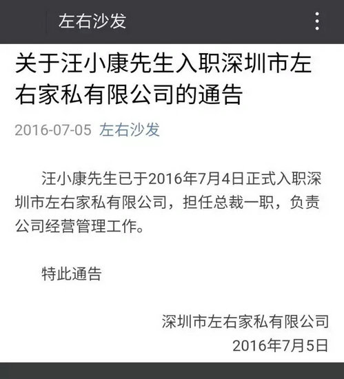 2016年7月4日,左右家私迎來一位新的總裁——汪小康,負(fù)責(zé)公司經(jīng)營(yíng)管理工作。