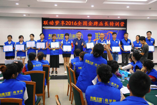 松堡王國(guó)銷售總監(jiān)汪克勝為學(xué)員頒發(fā)畢業(yè)證并合影