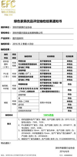 深圳市圓方園實業(yè)發(fā)展有限公司二季度4月份的抽檢結(jié)果顯示“100%符合”,抽樣產(chǎn)品圓方園系列的紡織品面料、PU皮、刨花板、中纖板及噴膠抽檢項目均達到“中國綠色家具優(yōu)品”標準要求。
