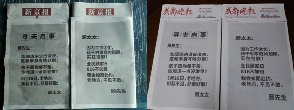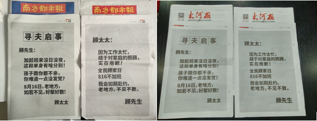 8月2日、3日,在全國(guó)各地具有影響力的報(bào)紙,頭版紛紛被“顧氏夫婦”包下。先是顧太太刊登整版“尋夫啟事”大肆尋夫,字里行間痛斥丈夫長(zhǎng)期加班,對(duì)家庭嚴(yán)重缺乏陪伴。微博大V第一時(shí)間轉(zhuǎn)發(fā)后,社交媒體頓時(shí)炸開(kāi)了鍋,話(huà)題閱讀量瞬間破百萬(wàn),引起網(wǎng)友熱議。