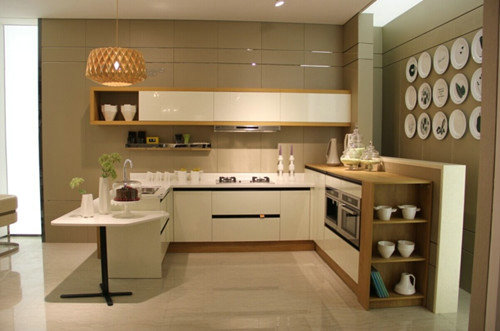 ——廚房柜。中國(guó)現(xiàn)在普遍用的是西方的廚房柜設(shè)計(jì)。這種設(shè)計(jì)都用德國(guó)的32mm系列,說(shuō)是定制,其實(shí)是規(guī)格化的。只是兩邊有收口,柜門(mén)、抽屜頭都是固定的,臺(tái)面用人造大理石、后成型防火板(Post-forming Melamine Sheet),只能說(shuō)不同房型,用不同個(gè)數(shù)的柜子,鋸好臺(tái)面的長(zhǎng)短,然后柜子兩邊收口。