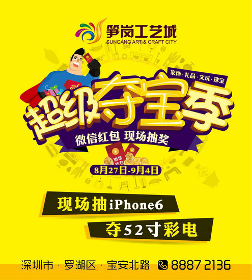只有微信紅包?只有神秘好禮?當然不夠,最后的福利千萬別錯過!8月27日-9月4日,凡在寶能筍崗工藝城購物累計滿300元,即可獲得“奪寶抽獎券”一張,參與現(xiàn)場超人氣奪寶!9月4日14:30,iphone6、52寸高清彩電準時現(xiàn)抽現(xiàn)送!