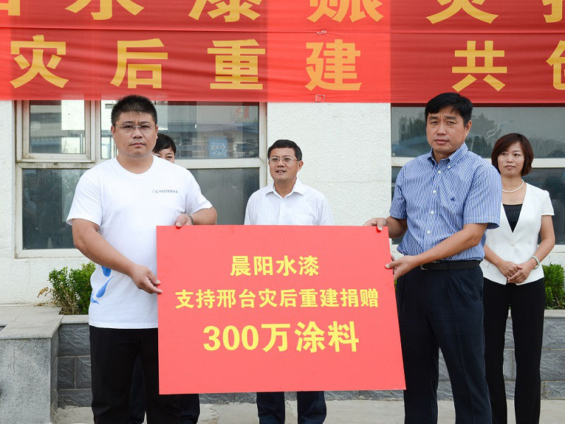 近幾年,晨陽水漆不僅累計捐資超過3000萬元,在災(zāi)區(qū)重建、扶貧幫困、支持“美麗鄉(xiāng)村”建設(shè)和捐資助教事業(yè)等工作上表現(xiàn)出不一般的社會關(guān)系。而就在這僅僅一個月來,晨陽水漆就舉辦了兩次公益活動。8月29日,晨陽水漆為7•19邢臺水災(zāi)災(zāi)區(qū)重建捐贈了價值300萬元的水漆。9月3日,晨陽水漆更是組織員工參加中青基金會“挑戰(zhàn)8小時”大型公益活動,為河北淶水縣的1000名農(nóng)村貧困家庭孩子募捐愛心善款。
