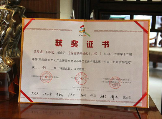2016年12月12日,第12屆文博會冬季工藝美術(shù)精品展“中國工藝美術(shù)百花獎”頒獎典禮在深圳會展中心舉行。經(jīng)評審,祥利集團《一團和氣圓臺)獲金獎,祥利集團《富貴牡丹梳化》獲銅獎。