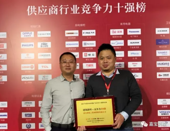 12月22日,“中國房地產(chǎn)年度采購峰會暨供應(yīng)商行業(yè)競爭力十強(qiáng)頒獎典禮”在深圳中洲萬豪酒店舉辦。500余位與會代表一起見證了20個行業(yè)競爭力十強(qiáng)的誕生,及陽光采購標(biāo)桿開發(fā)商的表彰儀式。其中,嘉寶莉榮獲2017年度中國房地產(chǎn)采購供應(yīng)商10強(qiáng)品牌。