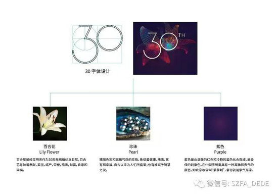 左右家私作為中國家具行業(yè)的領(lǐng)導(dǎo)者,其品牌具有高貴又不失親切的氣質(zhì)。DEDE國際設(shè)計團(tuán)隊從左右家私的品牌基因出發(fā),結(jié)合公司為30周年慶典設(shè)定的活動意義,為本次活動專門設(shè)計了象征30年幸福的獨一無二的“百合花”,結(jié)合智慧靈氣的“珍珠彩貝”效果以及高貴典雅的“紫色”基調(diào),造就了這次30周年慶典的主題畫面形象。