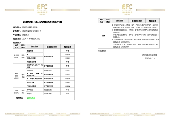 12月23日,中國(guó)綠色家具優(yōu)品2016年四季度10月份抽檢工作完成,松堡王國(guó)本月共抽檢2款膠粘劑、2款水性涂料及2款路軌,原輔材料抽檢合格率100%,作為首批優(yōu)品獲證企業(yè),品質(zhì)再次引領(lǐng)兒童家具。