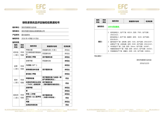 12月23日,中國(guó)綠色家具優(yōu)品2015年四季度10月份抽檢工作完成。作為目前中國(guó)家具唯一參與的軟床企業(yè),圓方園的品質(zhì)受到行業(yè)的高度關(guān)注。經(jīng)過(guò)深圳家具研究開發(fā)院檢測(cè)中心賽德檢測(cè)的嚴(yán)格抽檢,圓方園10月份原輔材料抽檢合格率100%,不負(fù)眾望。