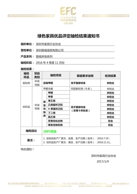 中國(guó)綠色家具優(yōu)品工作啟動(dòng)以來(lái),抽檢工作在深圳家具研究開(kāi)發(fā)院檢測(cè)中心(賽德檢測(cè))主導(dǎo)下有條不紊的進(jìn)行。2017年初,2016年4季度11月份的抽檢工作圓滿完成,深圳路福寢具有限公司路福床墊系列抽檢結(jié)果100%符合。