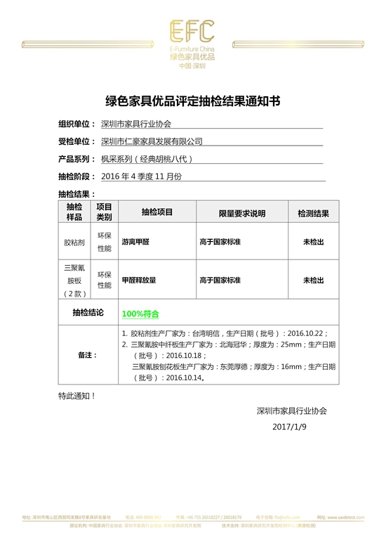 中國(guó)綠色家具優(yōu)品工作啟動(dòng)以來(lái),抽檢工作在深圳家具研究開發(fā)院檢測(cè)中心(賽德檢測(cè))主導(dǎo)下有條不紊的進(jìn)行。2017年初,2016年4季度11月份的抽檢工作圓滿完成,深圳市仁豪家具發(fā)展有限公司楓采系列(經(jīng)典胡桃八代)抽檢結(jié)果100%符合。