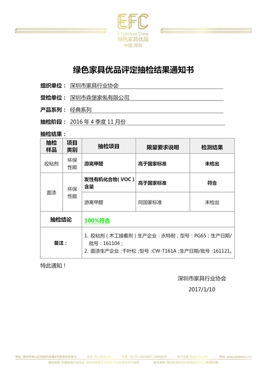中國綠色家具優(yōu)品工作啟動(dòng)以來,抽檢工作在深圳家具研究開發(fā)院檢測(cè)中心(賽德檢測(cè))主導(dǎo)下有條不紊的進(jìn)行。2017年初,2016年4季度11月份的抽檢工作圓滿完成,深圳市森堡家俬有限公司經(jīng)典系列抽檢結(jié)果100%符合。