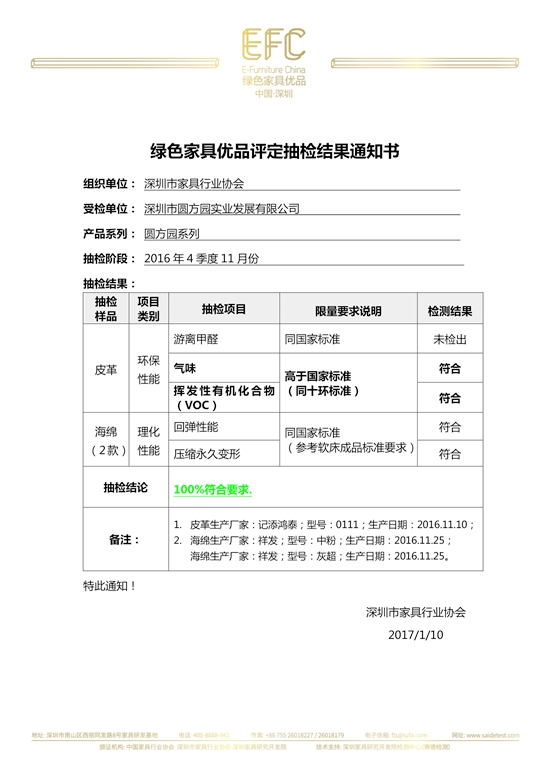 中國綠色家具優(yōu)品工作啟動以來,抽檢工作在深圳家具研究開發(fā)院檢測中心(賽德檢測)主導下有條不紊的進行。2017年初,2016年4季度11月份的抽檢工作圓滿完成,深圳市圓方圓實業(yè)發(fā)展有限公司圓方園系列抽檢結(jié)果100%符合。