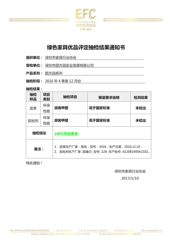 2017年1月10日,2016年中國(guó)綠色家具優(yōu)品四季度12月抽檢結(jié)果正式公布,深圳市圓方園實(shí)業(yè)發(fā)展有限公司圓方園系列被抽取的皮革和膠粘劑的游離甲醛抽檢結(jié)果均顯示“未檢出”,合格率100%,全年優(yōu)品抽檢工作完美收官。