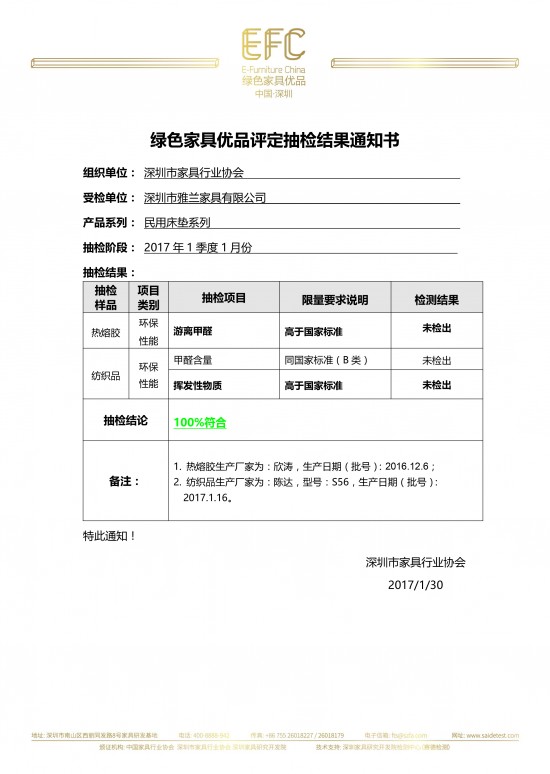 2017年,雅蘭進(jìn)入中國綠色家具優(yōu)品抽檢第三年。1月30日,深圳市家具行業(yè)協(xié)會(huì)檢測(cè)中心(賽德檢測(cè))針對(duì)雅蘭一季度1月份的抽檢完成,針對(duì)熱熔膠的游離甲醛、紡織品的甲醛含量和揮發(fā)性物質(zhì)的環(huán)保性能檢測(cè),均顯示“未檢出”,雅蘭床墊所用原材料的環(huán)保品質(zhì)大大高于國家標(biāo)準(zhǔn),比肩國際標(biāo)準(zhǔn)。