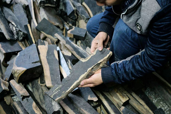 一個(gè)轉(zhuǎn)角,黃國棟看到了一堆堆放在陰暗的廢棄房里的紅木邊角料。這些紅木邊角料由于材料形狀不規(guī)則,或被蟲蛀,或腐爛,在家具開料時(shí)遭遺棄,從而擱置在一旁,沒有意外的話,將變成燒飯的柴火。