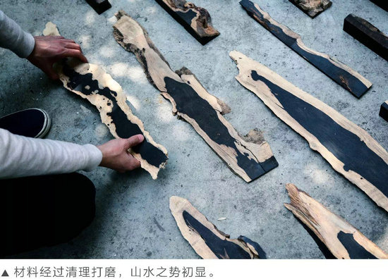 然而,黃國棟從中發(fā)現(xiàn)了轉(zhuǎn)機(jī)。這些木塊上的紋理,不同程度的“傷疤”,好像是隨意潑灑在宣紙上的墨汁,在木塊上凝結(jié),形成了一幅幅別有韻味的中國水墨畫。